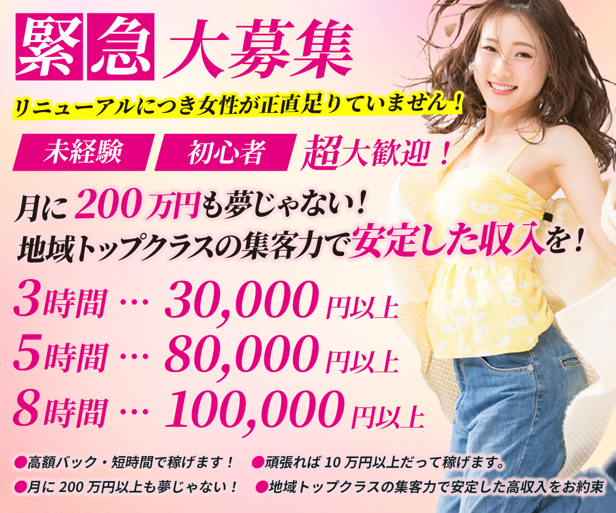 | 他店との違い | 当店独自に考えたシステムで安全に楽しく働けるお店作りを心がけています。 当店はネット中心のお店なので、誰かバレたくない、楽しく働きたい、しかも稼ぎたい、と言う女の子にはピッタリのお店です。 ※研修期間3ヶ月あり |